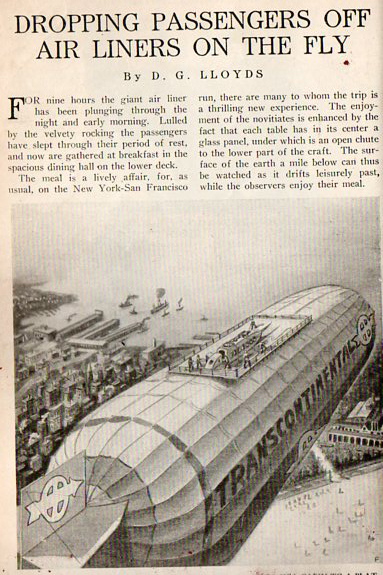 It seems to me that after floating along for days at 75 mph (or thereabouts?) that, after finally getting across the country, a traveler might want to simply disembark. But this behemoth envisioned by Lloyds wouldn't have to actually stop--it was outfitted, designed to release/accept passengers while in flight. Now of course take-offs and landings are the most dangerous parts of flying, and perhaps this is what Lloyds was trying to replace. But to me it looks like he replaced one significant danger with, well, several other significant dangers.
