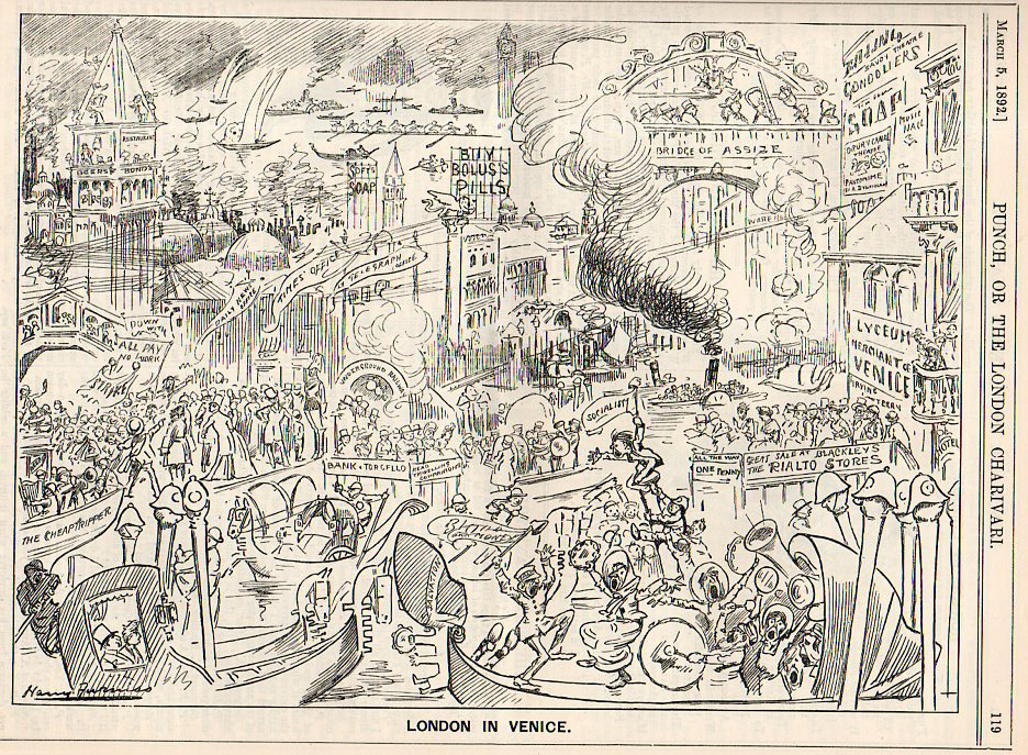 This is a funny, unexpected and semi-absurd image, especially I think for 1893. It occurs in the 5 March 1892 issue of Punch, or the London Charivari and seems quite literally to place bits and pieces of London on top of Venice, as if to show what that city would look like it it had some sort of urban renewal involving the removal of another city entirely to that place. Its quite a neat idea, really, to put one city's buildings on the topography of another city--it would be an interesting exercise, say, to place Manhattan in Savannah or Rome in Cape Town. Perhaps it would be revealing in some way, if for no other reason than to visualize buildings in another scale.