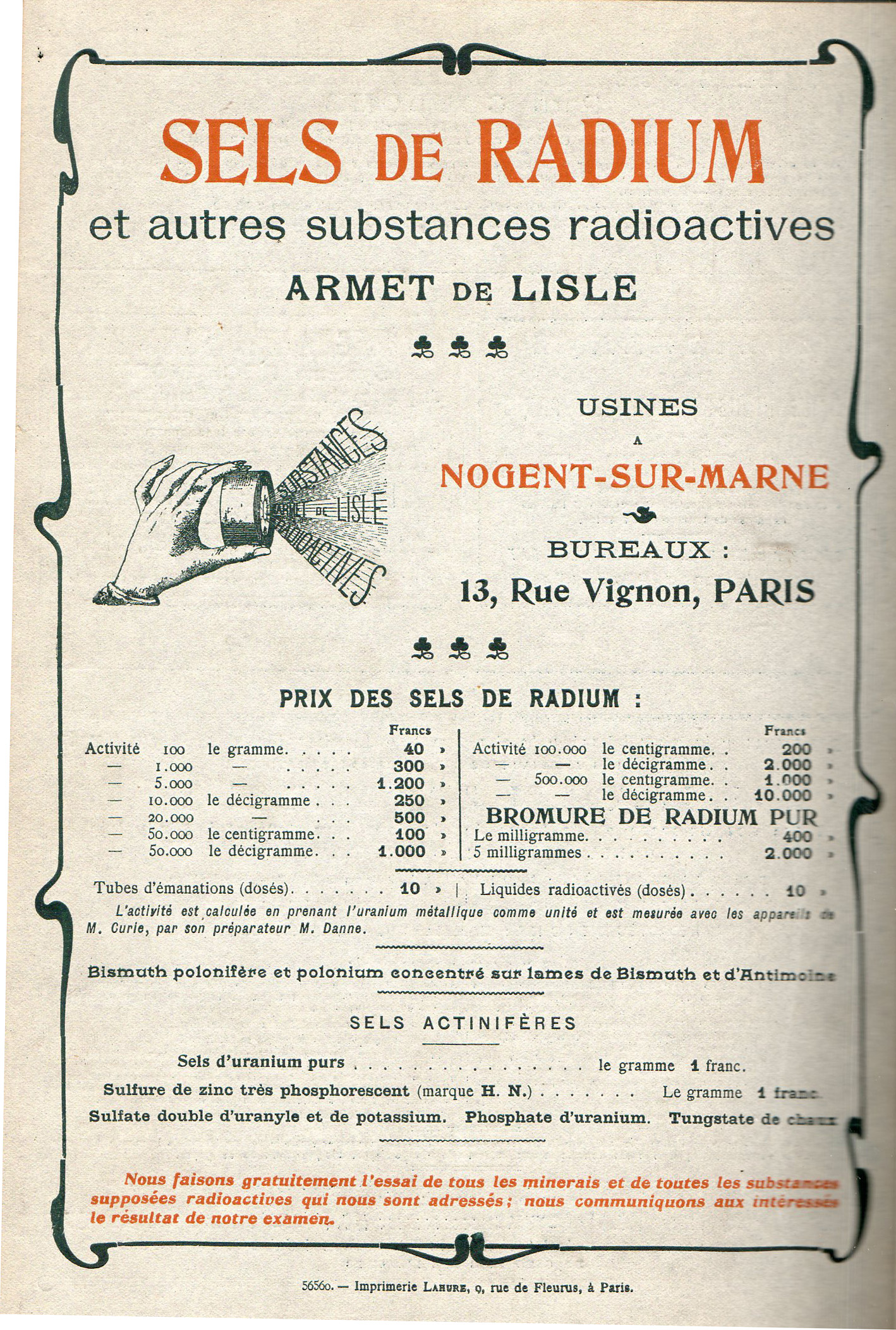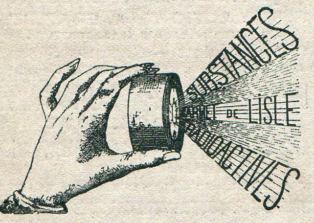 This is a detail for an advertisement for radium salts, found in the December, 1903 issue of Le Radium. At this point, just five years after the Curies discovered it and quick-published (in five days) their results in the Comptes Rendus..., the massive biochemical effects of human/radium interaction was not understood. And so the ads for firms like Armet de Lisle, which was loudly selling Sels de Radium (and other radioactive substances like uranium salt and uranium phosphate) without any real knowledge of the adverse health effects of its products. (The Curies and Becquerel had noticed ulcertating reactions to their skin when it was left in contact to radium, and "radium dementia" had been reported beginning about 1900, but it would take quite some time for this radioactive material to be understood as lethal products.)