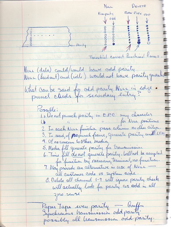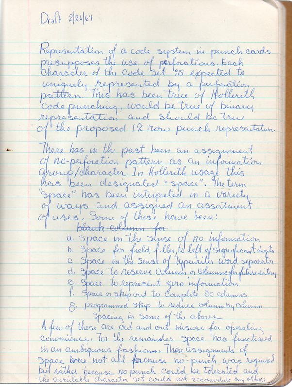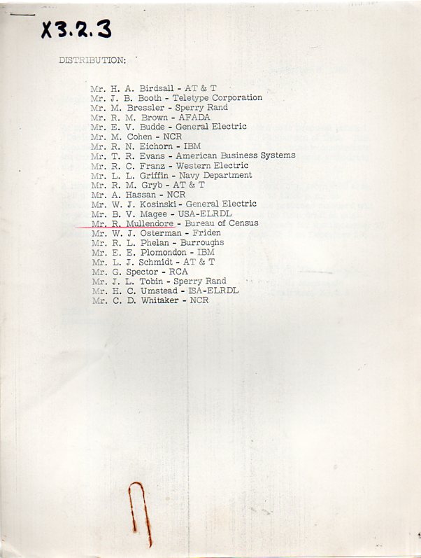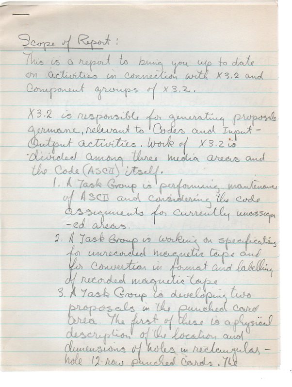 Manuscript notes (four pieces) and related support publications (fourteen pieces) on the development of ASCII (the backbone of electronic communications) from one of the 70 members of the main (designated "X3.2") development team. Ralph Mullendore1, the former engineer at the U.S. Census Bureau responsible for (among many other things) the testing, performance, evaluation and installation of the UNIVAC I at the Bureau. It looks to me as though Mullendore was a team member in general (the sub-committee X3.2) and a member of the development task group of for punch card standards and ASCII ("X3.2.3"), for "representations of ASCII in punched form" as well as X3.2.1.