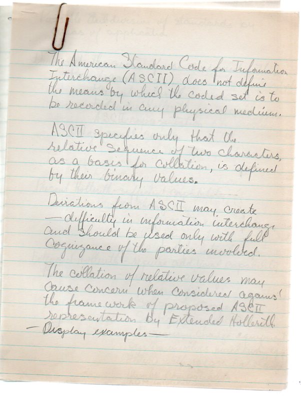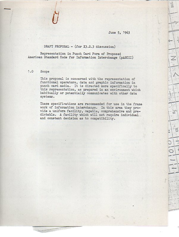 The History of ASCII. I just wanted to include this short bit on a small archive of material related to the development of ASCII from one of the team members who helped to create it. A more full description appears in the "continue reading" section, below. [Since writing this in 2012 the archive has been donated to special collections at North Carolina State University at Raleigh, where I assume it can be viewed and utilized.]
