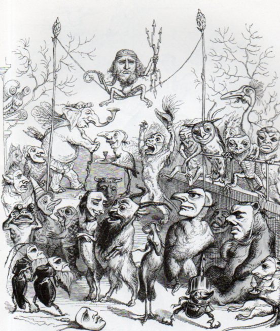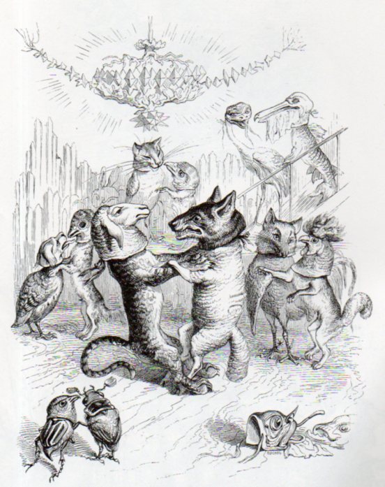 An unflattering masquerade of animals in human masks, all of which is enjoyed by a gallery of other animals (again from Un Autre Monde):