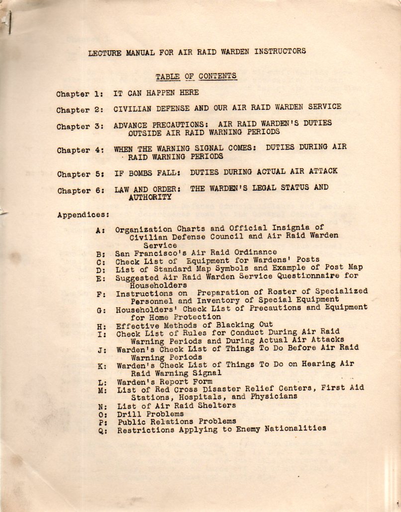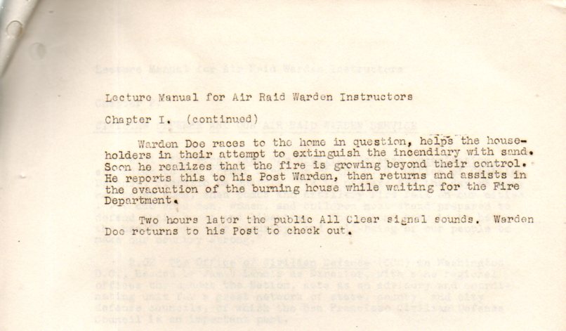 Lecture Manual for Air Raid Warden Instructors is in its way a remarkable document revealing some of the thinking and interpretation on the chances for the invasion of the American west coast just a few months (March 9, 1941) following Pearl Harbor. Undertaken and published by the Workers of the Writers' Program ('of the Works Projects Administration in Northern California") it was a product of one of the number of the Roosevelt administration's social engineering programs that had a long lasting effect.
