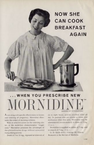 Mornidine evidently was the practical way for housewives with "problems" to solicit their morning best, enabling them to drag themselves out of bed, fix their hair and put on make-up, and then cook the morning breakfast. Without a cigarette.