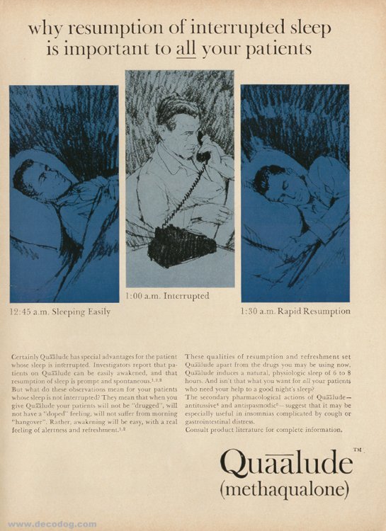 And for those who had trouble regaining sleep after some minor upset, there was also Quaaludes, which was much-abused in the 1970's as an overall body-relaxer and which could be found, fibromialgically, in The Parents"medicine" cabinet: