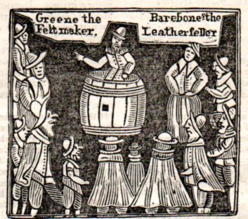 This quaint woodcut appeared as the cover illustration to a pamphlet entitled A Word to Fanatics, Puritanism and Sectaries1; or, New Preachers New, and it answers my question: the screamer is Mr. Praise-God-Barebone who is attended by his attender, a more-commonly named Mr. Green ("the Feltmaker"), and is shown preaching to a small crowd, many of whom are shown with long faces and in deep caricature, more so to mirror words they are hearing. Barebones is not presented in a friendly light, as the pamphlet was a warning to the general reader of the rising crowd of untrained and possibly heretical religicos who were gathering attention in and about London in the (Cromwellian fanatical) 1640's. They were seen as diffident, destructive, and definitely of the dimpled damaged variety of street entertainer. The interestingly-named pamphlet and Mr. Barebone was reported by the magazine, The Mirrour, (July 19, 1823) as "the object of the work is to ridicule such persons without education undertake to expound the Scriptures, and who, ignorant themselves, have the vanity to pretend to teach others". The powers that be were not amused.