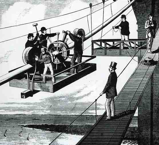 of the half-completed* Brooklyn Bridge, showing master mechanic and chief engineer of the project E.F. (Frank) Farrington making his slidy way as the first person to cross between the two spans (on 26 August 1876).