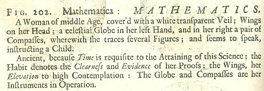 I chose "Arithmetic" as my first example because of the lovely parallels found in the folds of Arithmetic's dress--musical notation, underneath which we see the faint "Pars Impars" (even and odd) to help settle the old scores of symmetry. The connection between music and mathematics is thousnads of years old, and though I might've used "mathematics" rather than its oldest branch (of "arithmetic") to show the ancinet connection between music and numbers, it should be remembered that not every aspect of arithmeic is standard, and that there is a good and strong relation between music and "higher arithmetic" (number theory). In general I just like the emblzoned connection here between the two, showing a temporal sequencing representation, a placing of music in relation to number right out there in time-and-space,an adept of the mental image of music. There is no doubt that when a viewer was finsihed with this image that there is a lasting property of the mathematical properties of sound and teh harmony of number. Its not exactly "music of the spheres", but it does work.
