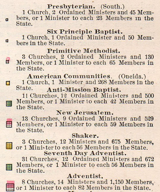 This display of quantitative data appeared in the Rand McNally atlas of 1890, and details the various religions as practiced and reported in New York state for the census of 1880. The work certainly gets it point across. See also: Fantastic Sqaure(s), 1840 and the blog series, Quantitative Display of Information.