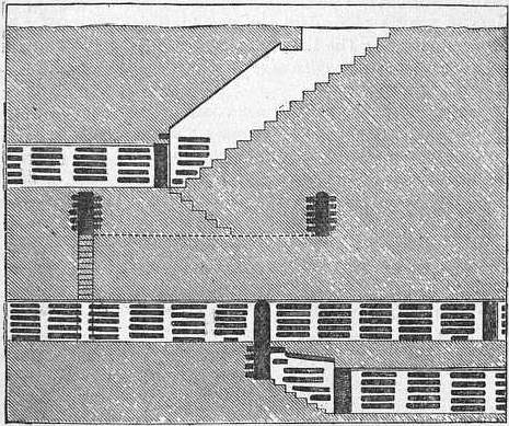 "These galleries are not arranged on any definite plan, but, as will be seen from the plan (fig. 1, above), they intersect one another at different angles, producing an intricate network which it is almost impossible to reduce to any system. They generally run in straight lines, and as a rule preserve the same level. The different storeys of galleries lie one below the other (fig. 2, below) to the number of four or five (in one part of the cemetery of St Calixtus they reach seven storeys), and communicate with one another by stairs cut out of the living rock."