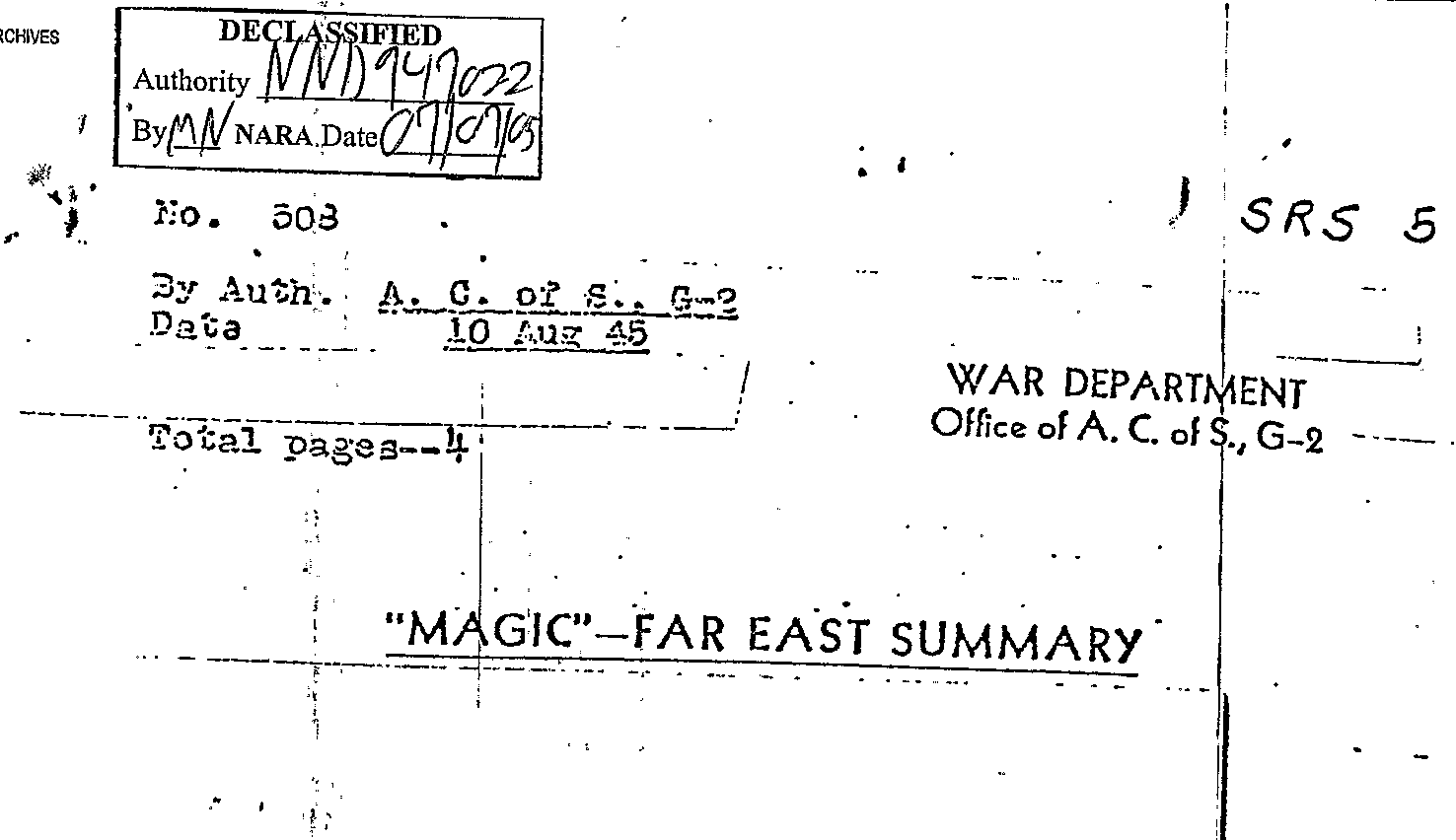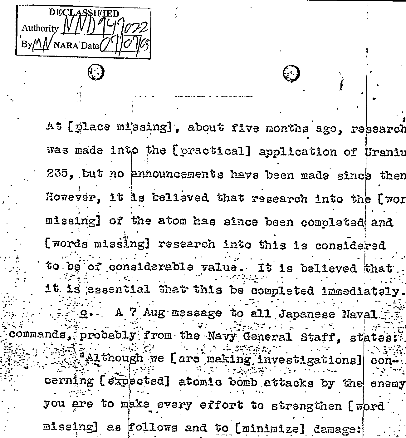 This is document 63 of 80 from "The Atomic Bomb and the End of World War II, a Collection of Primary Sources", from the National Secuiry Archive Electronic Briefing Book No 162, edited by William Burr (2005). (The full source is available here.) It is here where there is a brief review of supposed Japanese development of an atomic bomb. the information was courtesy of the MAGIC, a cryptonym for the successful effort of the United States Army Signals Intelligence Section (SIS) and the Navy Communication Special Unit to decode intercepted high-level Janapese messages. (A quick appraisal of MAGIC is available here.) Suffice to say for this quick post that the efforts of American cryptographers (with some help from our cousins in the U.K. at Bletchley Park) landed the U.S. the ability to read and render Japanese critical and encoded communications virtually from the very beginning of the war.