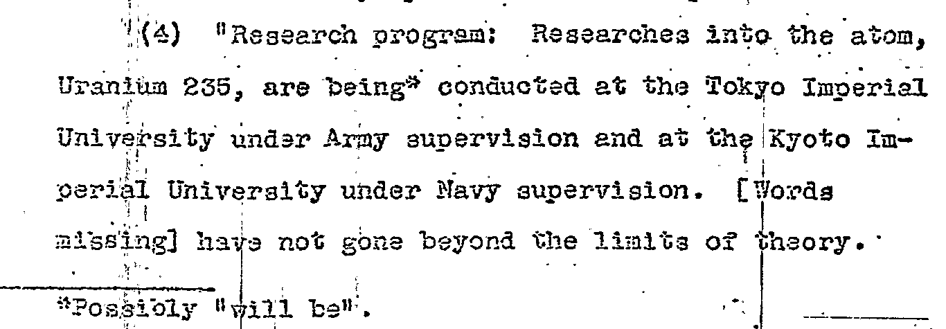 Page three of the MAGIC document reveals that the Japanese government may/may not have been in the earliest developing phase for builidng an atomic bomb for themselves. It is unclear if the word/sentence segment refered to something that was or somethat that could be. Nevertheless, it was reported that planning had not exceeded the initial phase. I think it is not debatable that the only country that had enough resources to develop the bomb in the 1940-1945 period was the United States--it was clearly beyond the means of any other country on the Earth to develop a bomb in 1945, and if memory serves the electrical power alone necessary for the production of bomb elements was already a substantial chunk of all of the power being generated in all of Japan in 1944.)