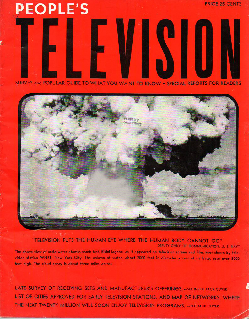 This short pamphlet was produced in 1946, and at the time it was still possible to believe in the great possible poetry that the new medium could produce. And it certainly did produce something, even in these early days, though I do not think it was poetry. It did deliver some measure of truth and accountability, though. It is difficult to imagine seeing the image of one of the earliest post-war atomic tests delivered to the DuMont Teleset in your living room. I imagine that the societal reaction to seeing these events broadcast may have been like when photography was brought to bear in the news reporting business. Harper's Weekly started to run woodcuts of Civil War battles with the imprimatur "from a photograph" rather than something like "drawn at the scene by our correspondent", readers were immeasurably more responsive to the drawing after a photography because of the undeniable archivitization that goes on when a photograph is made, as the memory of a photograph is for the most part unimpeachable. This delivered an instantaneous increase in the belief in the reporting.