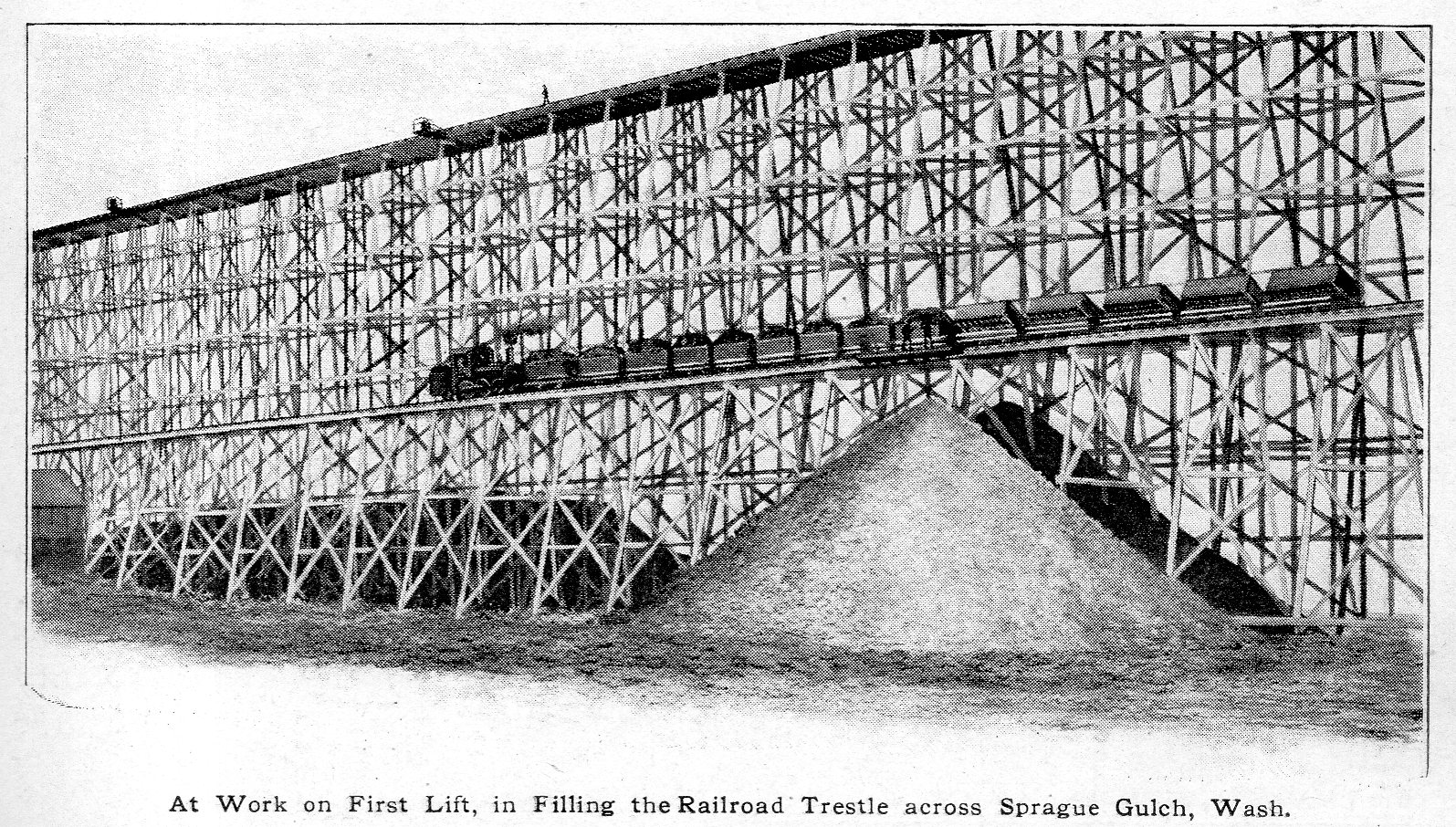 "Exceptionally Large Trestle Fill" is the rather Engineeringly Prosaic header for this Popular Mechanics article from March 1912. The 4,869' span was at Sprague Gulch, "near Lamont, Washington" for the Spokane, Portland & Seattle RR, stood 101' above the water (at its highest), and the idea was to backfill a foundation for stability--a project that was found to be cheaper than building a steel structure.