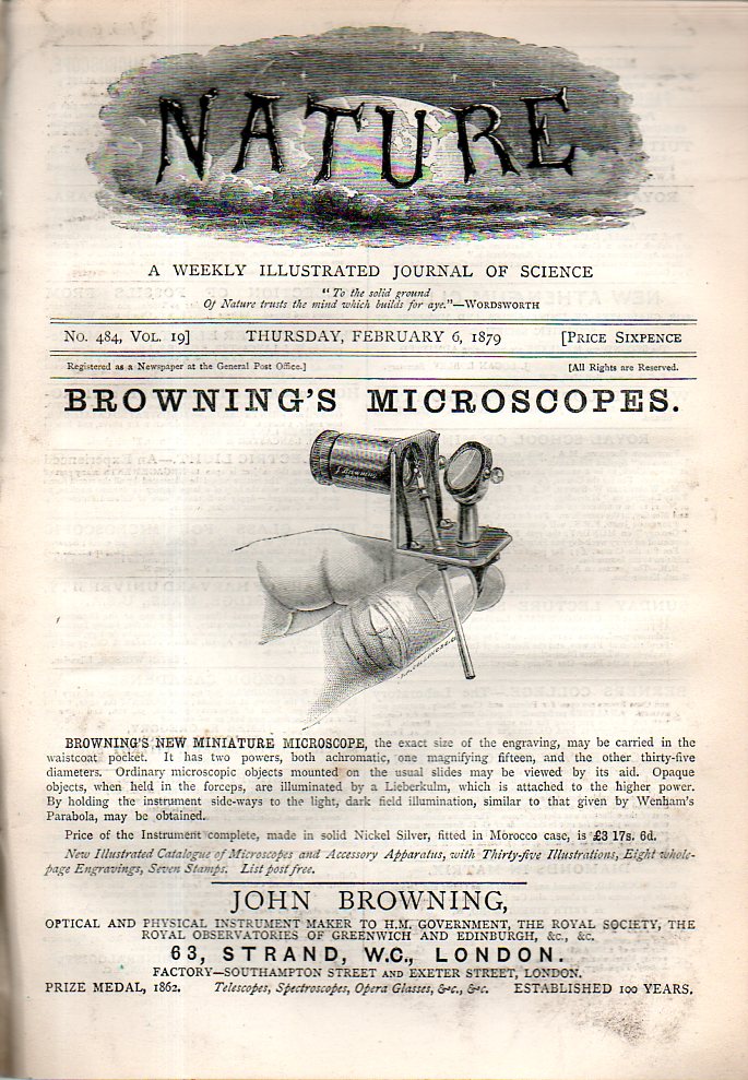 This is just so splendid, I had to stop and admire it, publicly. The design of the front page of Nature is a lovely thing in itself, and the placement, and spacing, it all works so well together. But the big treat of course is the "Browning New Miniature Microscope", which we are told is in 1:1 scale. It "may also be carried in the waistcoat pocket" if only I could remember where my waistcoat was. The instrument was good for 15x and 35x, and came prepared with tiny foreceps to hold natural objects, but it was also of course built to accept miniature slides. Just for the record, 19th century microscope slides are generally things of high beauty--miniature microscope slides from that time are quite simply the bee's knees.