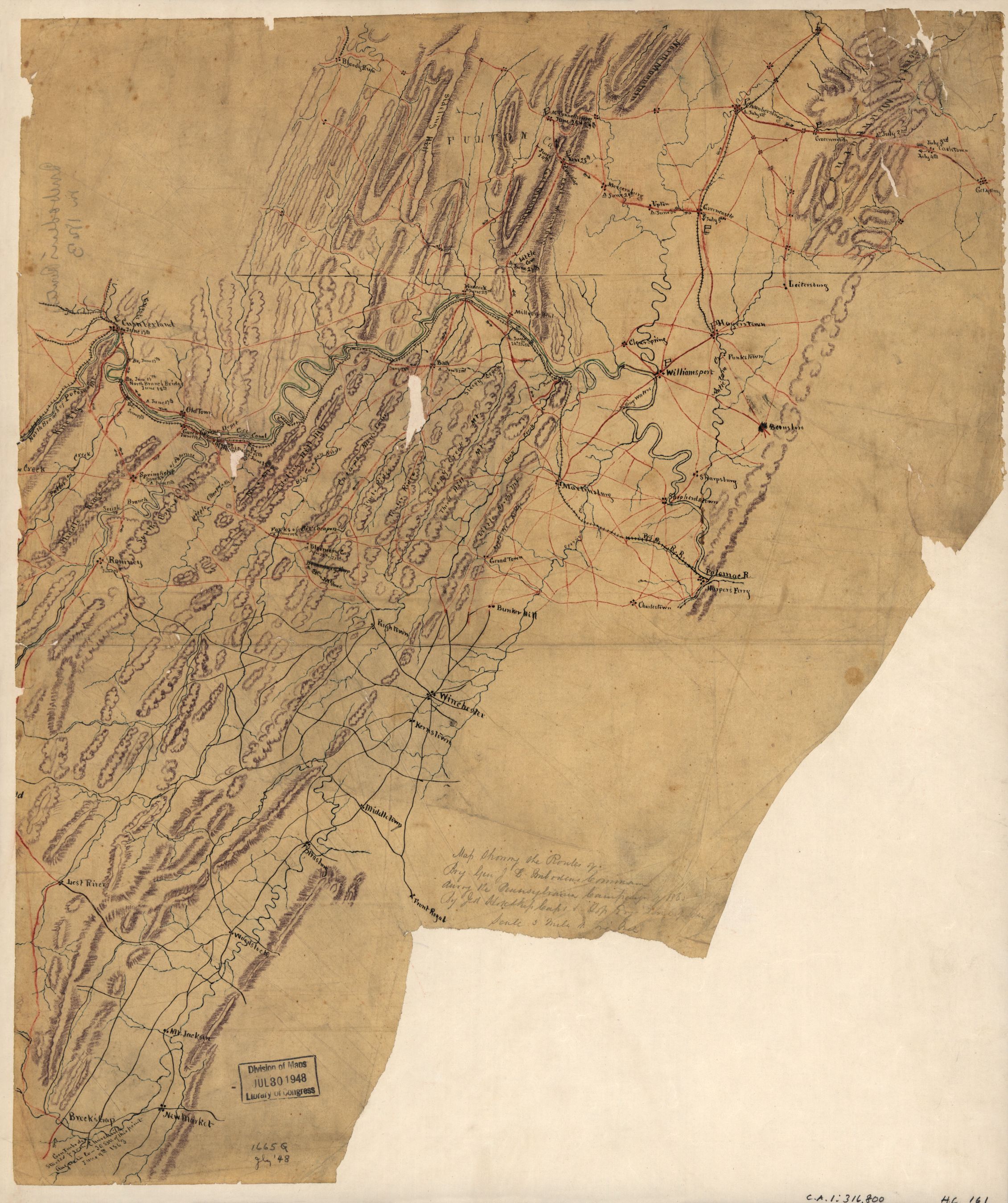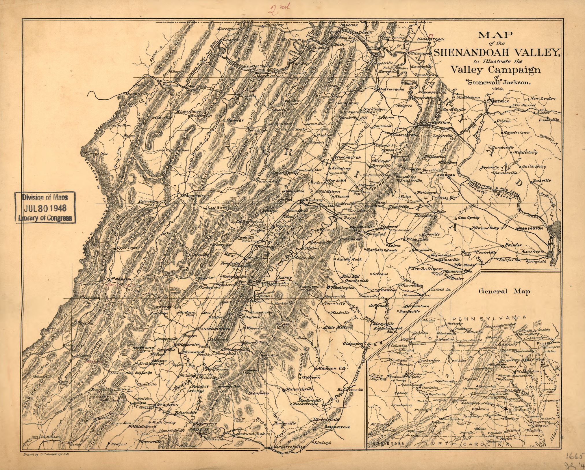 "The Hotchkiss Map Collection contains cartographic items made by Major Jedediah Hotchkiss (1828-1899), a topographic engineer in the Confederate Army. Hotchkiss made detailed battle maps primarily of the Shenandoah Valley, some of which were used by the Generals Robert E. Lee and Thomas J. "Stonewall" Jackson for their combat planning and strategy. Several of the maps have annotations of various military officers, demonstrating their importance in the military campaigns..."--from the LC site. A good, long essay on the collection by Clara LeGear appears elsewhere on the LC site, here.