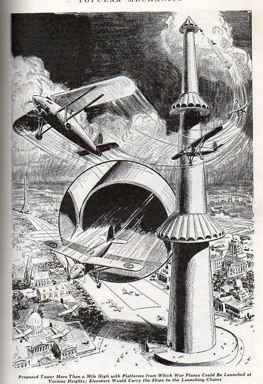 In the history of Mile High Things I doubt there are many entries for airports--or half-airports. This if not highly questionable structure inverted the horizontal concept of airport into something else, or at least changed the take-off into quite something different while leaving the landing strips the same. (This is the "half-vertical" part of the title to this post; "half-vertical" doesn't mean "horizontal", though I like that idea.) The new method of getting a plane into the air was straightforwardly breathtaking: haul the plane up one mile in an elevator and drop it through one of the "launching chutes". After everything is said and done, this is one idea that really didn't need to be three-dimensional.