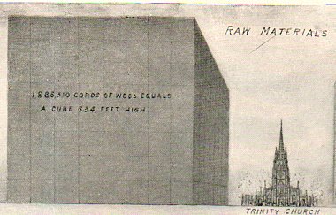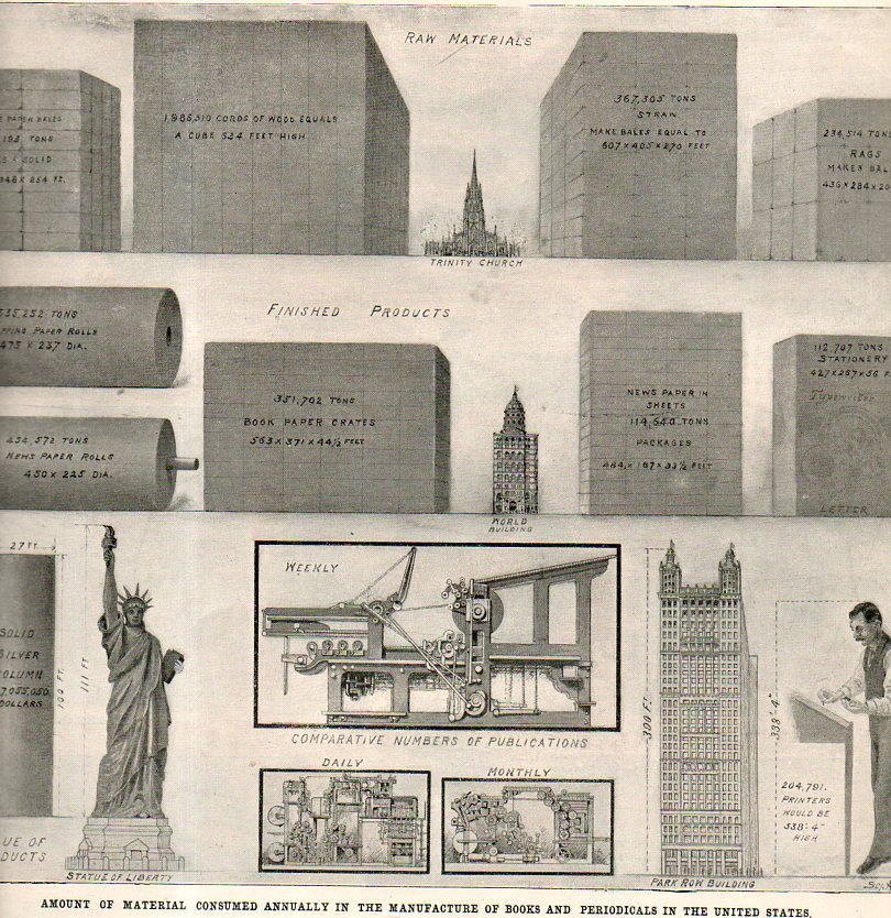 The rather dry article appearing in the 14 November 1903 issue of Scientific American discussing the comparison of raw and finished products in the printing and paper making industry survives itself in a glorious way with a captivating infographic explaining things in terms of units of Trinity Churches and Statues of Liberty--and that's what makes the difference in presentation of data and the artistic display of statistical information.