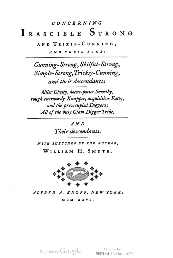 I'm not sure what is going on or not going on in these diagrams/charts from the unusually-titled proto-outider-humorist Concerning Irascible Strong and Trixie-Cunning, and their sons: Cunning-Strong, Skilful-Strong, Simple-Strong, Tricksy-Cunning, and their descendants, by William H. Smyth (and printed in 1926). It is a lot of title to live up to. Or down to. In any event, the meaning behind it all is a mystery to me, but the mystery behind not wanting to know what it was all about is not a mystery at all--after all, isn't a plate of spaghetti prettier as a mess than it is all straightened out?