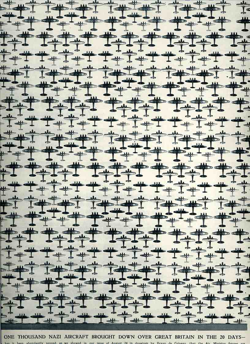 This tremendous display is half of a double-page spread that appeared in The Illustrated London News for 7 September 1940. It was meant to bolster the civilian population of Britain during the time of the German attacks, shoping that "Over one thousand Nazi aircraft (were) brought down over Great Britain in ...20 Days..." The artwork, drawn by Bryan de Grineau, actually depicts 1000 planes, and accurately depicted ones at that. What the graphic doesn't tally though are the airmen losses, which would be considerably more than the 1000 aircraft: for example, of the aircraft involved in the sustain air-invasion of England, the Dornier 215's had a crew of four, Dornier 17's three, Heinkel 111's four, Messerschmitt 110's two, and Junkers 88's three. Thus there were thousands more airmen lost, a commodity that the Nazis could little afford.