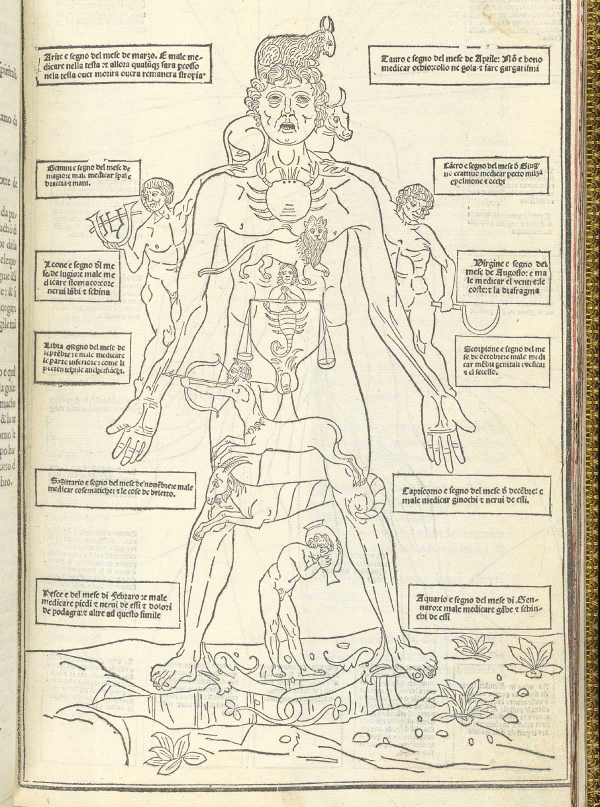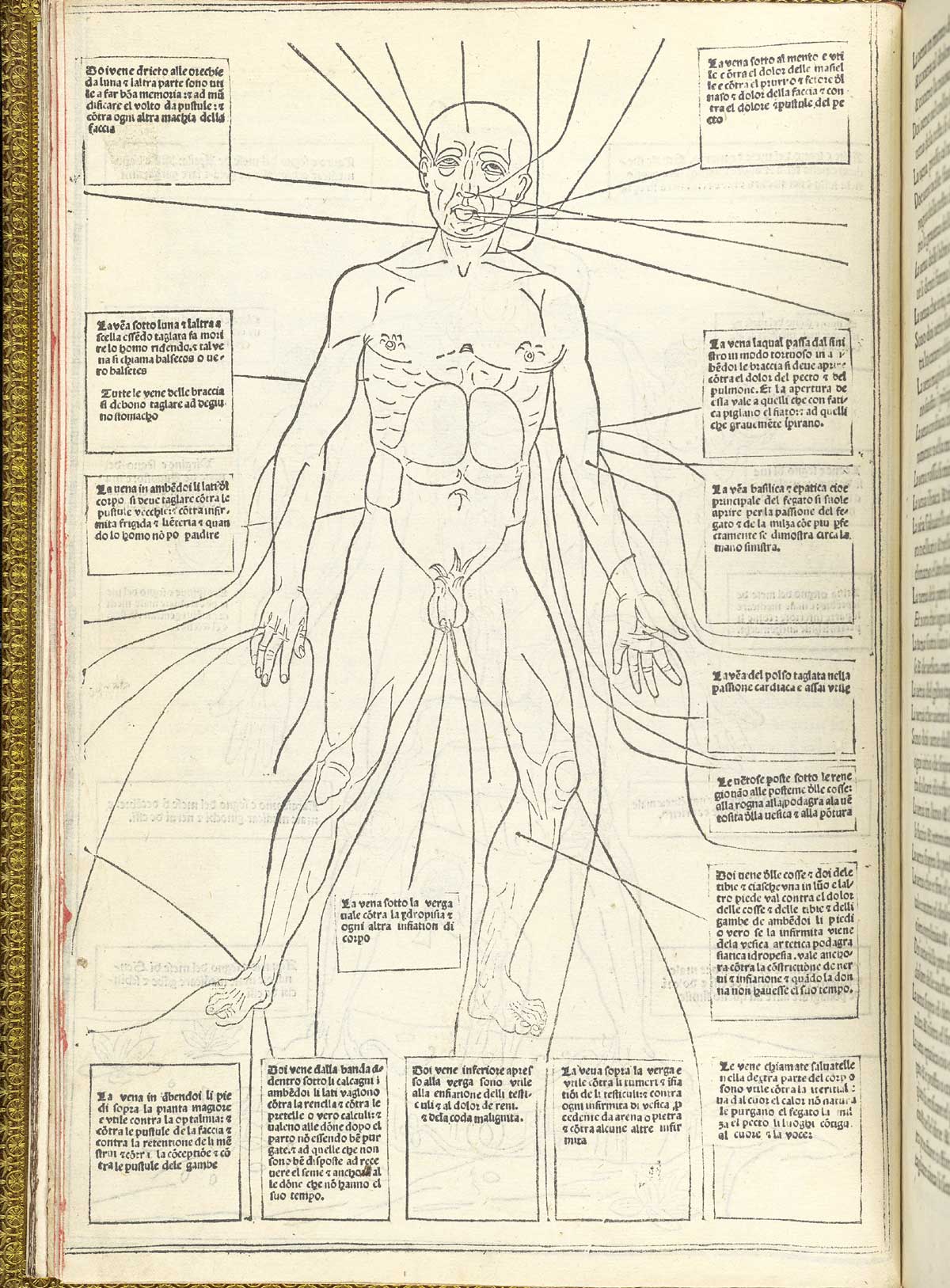 Johannes de Kehtam's Fasciculus Medicine (printed in Venice in 1500) was the first anatomy to be printed with illustrations. Ketham was described as a German doctor living in Italy and may well have been Johann von Kerchheim, a German practicing surgery and medicine in Venice during he 1470'), and who wrote a series of tracts on various aspects of medicine which were then collected into this single bound volume. The illustrations are spectacular and to me have a very modern sensibility in their mid-Renaissance woodcut legacy--the look very clear and concise, are well proportioned, nicely labeled, and give plenty of free rein to open and blank spaces on the woodblock. The only time these images really "fail" is when they appear in color--a process that would've been undertaken privately, by the purchaser of the book, who would have contracted with an artisan to color the book. The images in almost all of the cases of coloring that I have seen just do not match the elegance and brilliance of the original with no color.