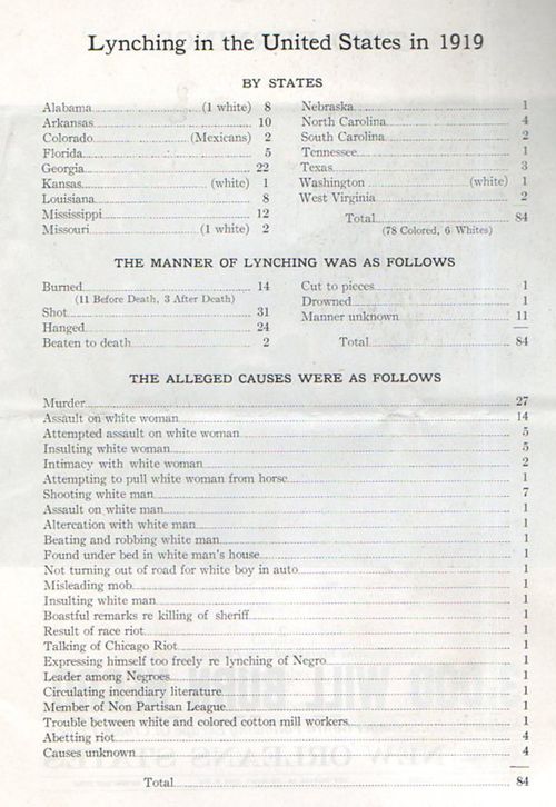 It was a very bleak record, an enormous stain on the country, to be presented with information like this, a horror. But lynching continued for years to come (with 5,000 more lynchings from 1921 to 1931), and the first federal anti-lynching legislation did not appear for another 15 years.