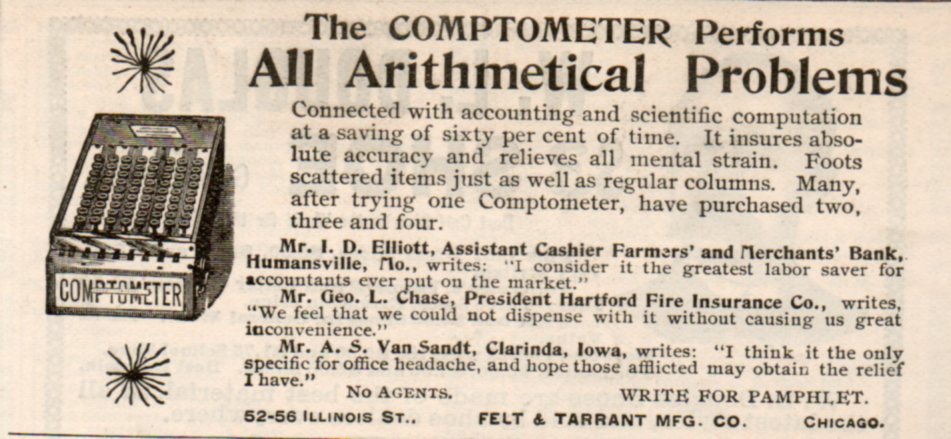 This magnificent image was--is--The Comptometer, a key-driven calculating machine made by Felt & Tarrant Manufacturing Company, a glorious instrument, encased in coppery metal, and just larger than a large shoebox. It was invented by Dorr E. Felt (1862-1930) in 1889, and in order to put his idea into production went into business with the Chicago businessman and entrepreneur Robert Tarrant, and the two made an enormously successful go of the whole operation, the machine being easy to carry, and easy to use, and saved a huge amount of time in calculating mounds of long figures.