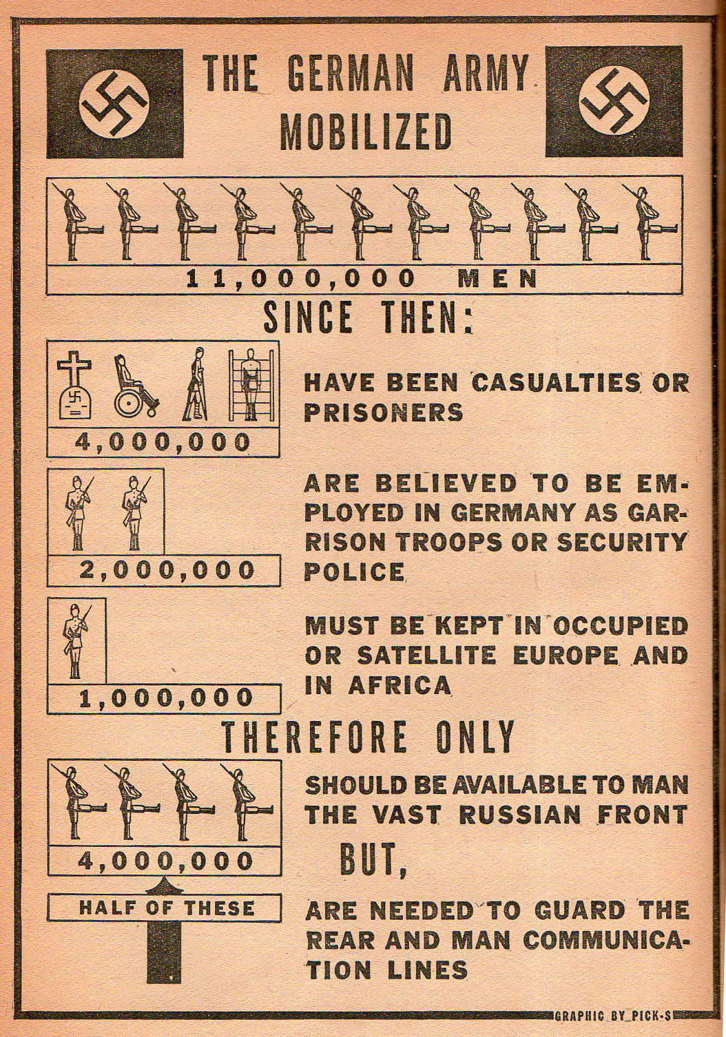 The U.S. was just beyond its first year in the combat part of WWII when this infographic was made and published in The Nation on January 2, 1943, and no doubt that it was of some considerable interest to portray the Nazi war machine with a little more alacrity. 1942 was a tough year in the history of the war, and the Nazi army was looking large and gray and tough-to-beat. The editors of The Nation sought to put a little more perspective in the viewing of the Wehrmacht in an attempt to show the actual fighting force size. It is an interesting result, though the display itself is actually somewhat intimidating, with the message a little lost in the shadow of the strong banner: