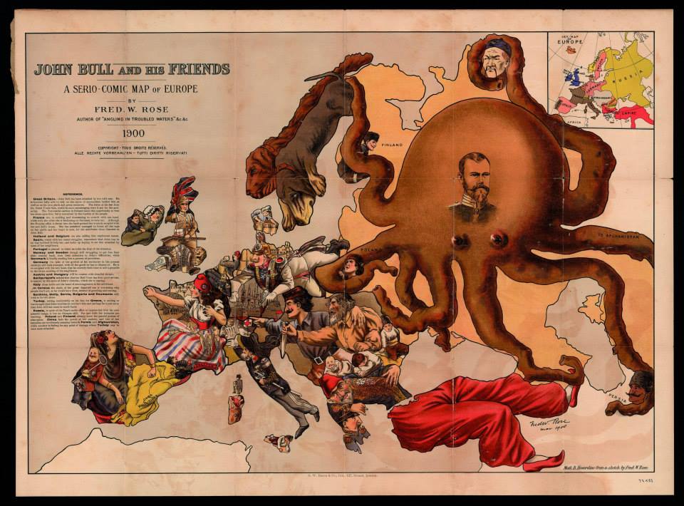 And the Russian octopus map, John Bull and His Friends. A Serio-Comic Map of Europe By Fred W. Rose…printed in 1900, and found at the Yale University Library Digital Collections, here: