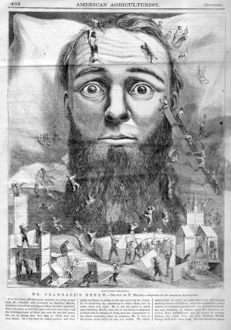 I've been looking at antique images for thirty-five years and in that experience it is easier to recall things that I do not often see--the missing-bits absences seem to be easier to recall than the many categories of images that I do see regularly. And one of those "missing" categories that was excited tonight by a serendipitous find is "dreaming", or the representation of a dream, as found in The American Agriculturalist for the Farm, Garden, and Household for December, 1869. It was an interesting appearance, being a good illustration wrapped around a product-placement ad, as the subject was a children's block manufacturer, and that's pretty much what the text was about. But the drawing was good and the imagination behind it was pretty nice, especially for 1869.