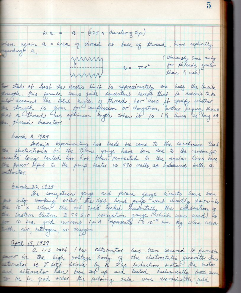 Scott was very hands-on in the project, though he makes infrequent references to others working on the project. He does mention John G. Trump (Ph.D. MIT '33, director of the high voltage lab and brother of D. Trump's father) and Jay Forrester (aa future Big Namer who at the time was a part-time research assistant in the high voltage lab under Trump). Also another major domo, LC van Atta, makes an appearance in the notes as does Prof. E.S. Lamar.