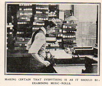 There is a certain layered, geological dystopic quality to the images of these men laboring at producing piano rolls for player pianos (and found in The Illustrated London News for 18 December 1909). This is true especially for the details, the small boxes in the background to where the rolls are being "processed"--music pounded out with metal points on a hard surface, as though produced by whatever it was that was in those little labeled wooden containers, far removed from the artistry of melody. These are images of a culture being made into hundreds of thousands of miles of hole-filled paper.