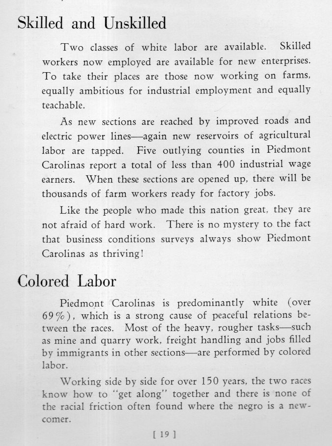 I was having a breezy little time looking through Piedmont Carolinas, Where Wealth Awaits You, published by Duke Power in 1937 and extolling the many virtues of living in the section of North Carolina between the western mountains and the western edge of the lowlands--this is not far from where I'm sitting right now, in the Southern Highlands, 50 miles west. I was enjoying reading about the beautiful roads, and the fine country (where farmers outnumbered industrial workers three to one).
