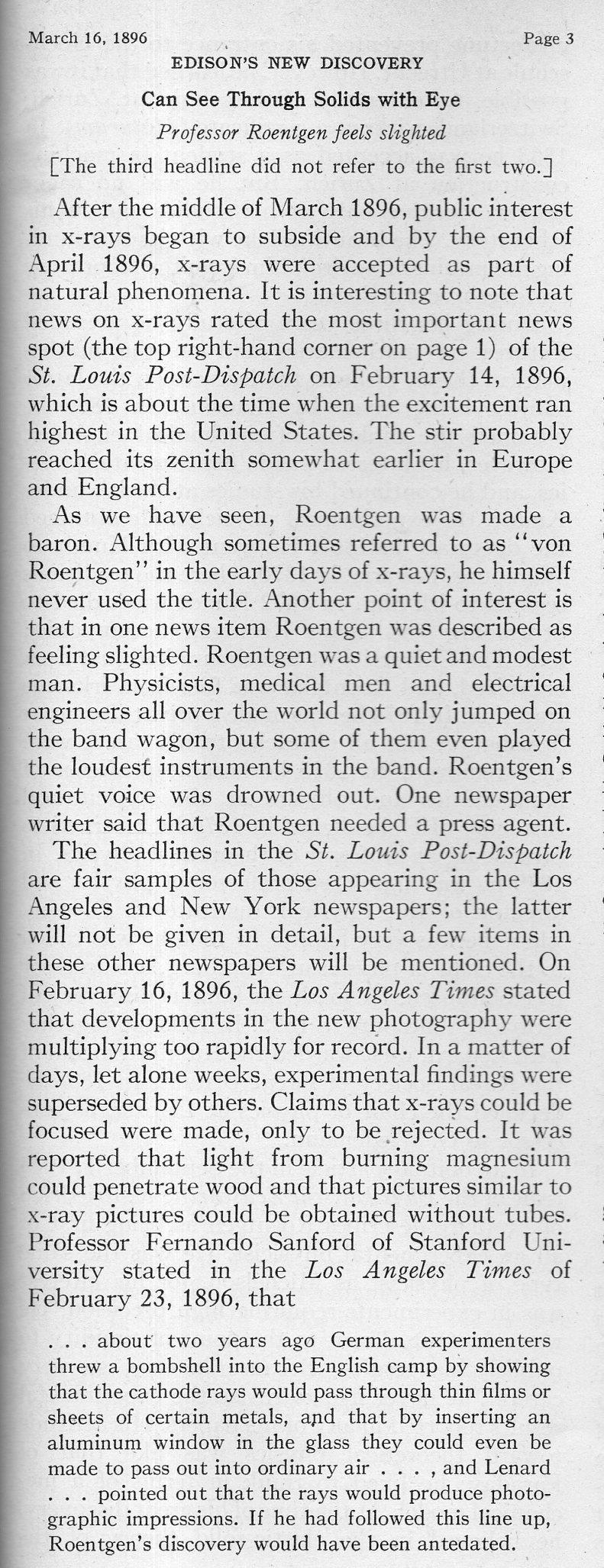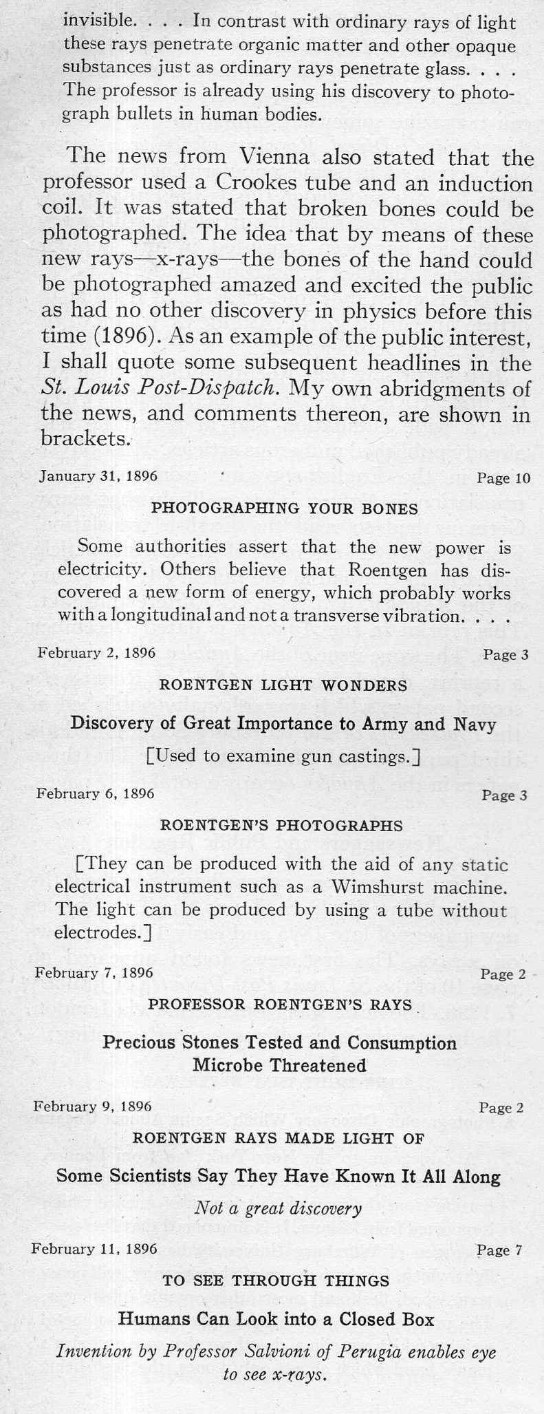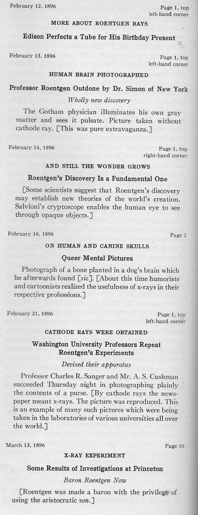 Scientific/technical journals as well as the popular press were flooded with articles published about the astonishing discovery of 50-year-old physics professor from Wurzburg.. The English-language popular science journal Nature's announcement of his December 28, 1895 “Ueber eine neue Art von Strahlen" ("On a New Type of Ray"), appearing 16 January 1896, began the introduction of a new state of human experience. His experiments—built upon the work of J. Pluecker (1801-1868), J.W. Hittorf (1824-1914), C. F. Varley (1828-1883), E. Goldstein (1850-1931), Sir William Crookes (1832-1919), H. Hertz (1857-1894) and Phil Lenard (1862-1947)—revealed as much to humans as did the experiments and inventions of Hooke and Leeuwenhoek on the invisible worlds revealed by the microscope. There are more than 150 articles on the Roentgen (and soon to be “X-“) Ray, all published within 12 months of the original announcement, almost all excitedly, trying to comprehend, elucidate, expand, verify, this new world1.