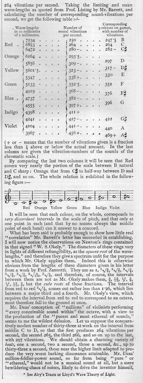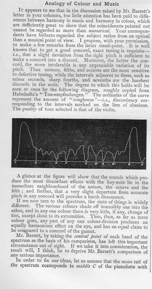 The experiment occurs as a sidelight to a very interesting and very early article by Sedley Taylor, "Analogy of Colour and Music", found in Nature, volume 2, February 24, 1870, in the letters to the editor section, p. 430. His work on analogy in music and color is very early, particularly by someone who was conversant in both worlds. (Taylor would translate von Helmholt's great work on the sensation of tone into English (On the Sensations of Tone as a Physiological Basis for the Theory of Music, publishing it in 1875.) Also in 1875 Taylor published his work on the color/sound subject in a book, Sound and Music. According to Cyril Rootham (1920):
