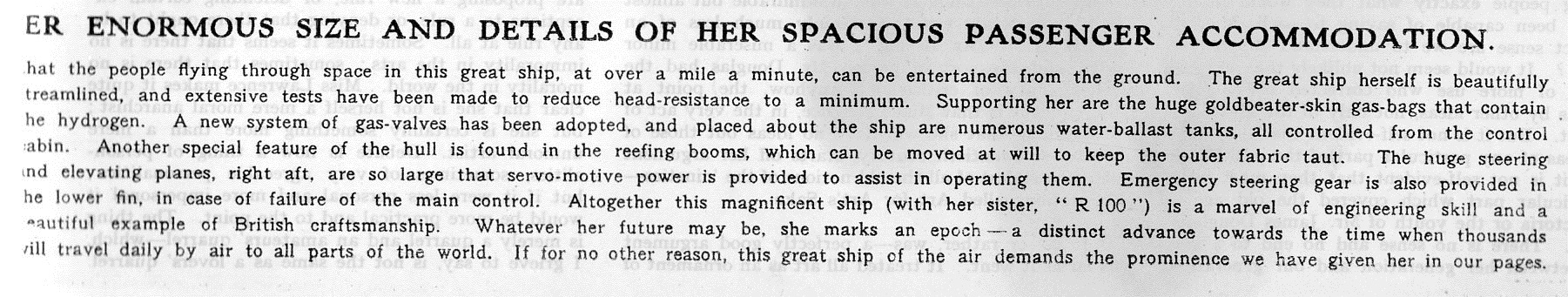 The R 101 was one of the largest lighter-than-air airships ever created. The ship was still about a year away from its maiden flight when this popular survey was published in the Illustrated London News on March 29, 1929--unfortunately this flight would also be its last, finding disaster over France on October 5, 1930. The airship was 777' long, 140' high, and had a volume of about 5 million cubic feet, and operated with a crew of 42--a big object.