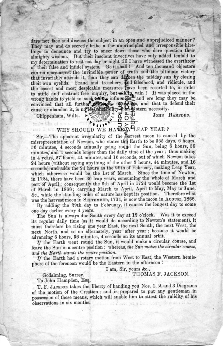 The pamphlet (actually just a folded sheet of paper) was the work of John Hampden, whose name is probably recognizable to those who have read in the swollen knuckle religious/scientific strife literature. He was a long opponent of the Earth as a sphere, basing much of his deep assertions on scripture. Hampden was that terrible mix of unctious and litigious, and fought with folks for decades, most famously with Alfred Russell Wallace, to whom he lost several libel suits costing him money and freedom over the long course of that inextinguishable dumpster fire.