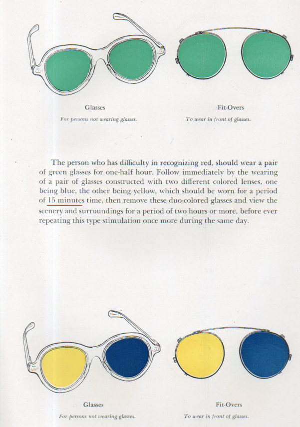 Admittedly I was more interested in the illustrations in this work1 than the text, mainly (and obviously) because the images are so striking. The text is in its way a pre-scientific attempt at 'curing" color blindness, which is a genetic disorder. The color wheels ("variable speed rotary color vision stimulator") were intended to be rotated to produce different color senses for "color vision stimulation"--it could be used to determine whether or not color vision was being "improved".
