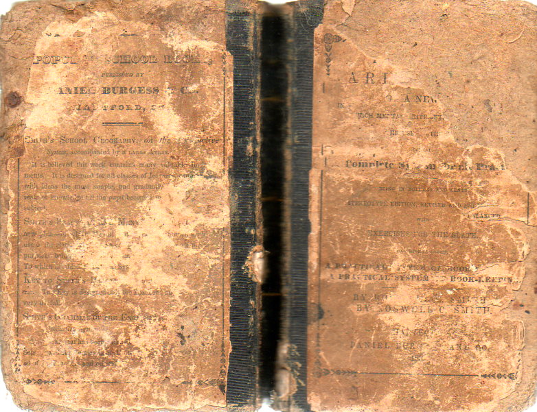 I have a little pocket-sized book at home, a fine little arithmetic book by Roswell C. Smith, Practical and Mental Arithmetic on a New Plan in Which Mental Arithmetic is Combined with the Use of the Slate--it was published in Hartford, and this copy was printed in 1836, in its every energetic 53rd edition. Mr. Smith wrote himself one fine and popular arithmetic tract, and the book is absolutely loaded with all sorts of info that could see a person through most aspects of figuring-life for years to come. My copy is very very well worn, and although it is missing pieces of the paper cover and the surface of the books looks like the Somme, it is actually very smooth--worn and rubbed smooth from years of use.