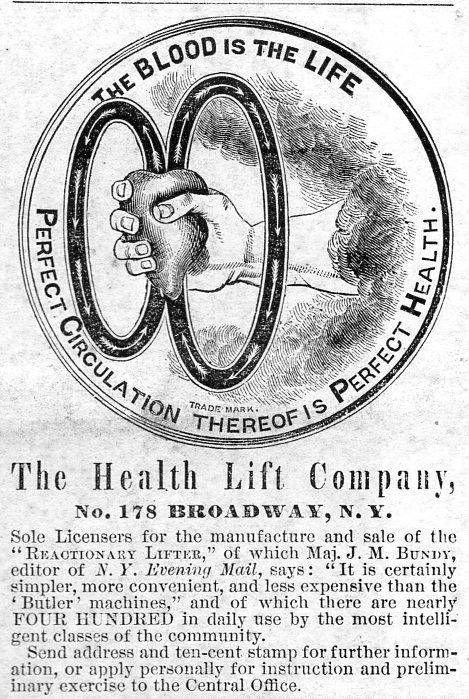 The ad is for the "Reactionary Lifter", an uninspired and slightly cumbersome name for an exercise apparatus that was made of hydraulics and pull-me devices that used the person's own weight to exercise against. The machine itself doesn't seem that interesting, though the price does. At $100 it would take the average machinist or a similar skilled job probably a year to save a hundred dollars while making $10/week and then removing expenses, so this exercise machine was a significant expense. There is no mention of a price in the Harpers placement, which I guess was a good move so as not not frighten off the casual reader.