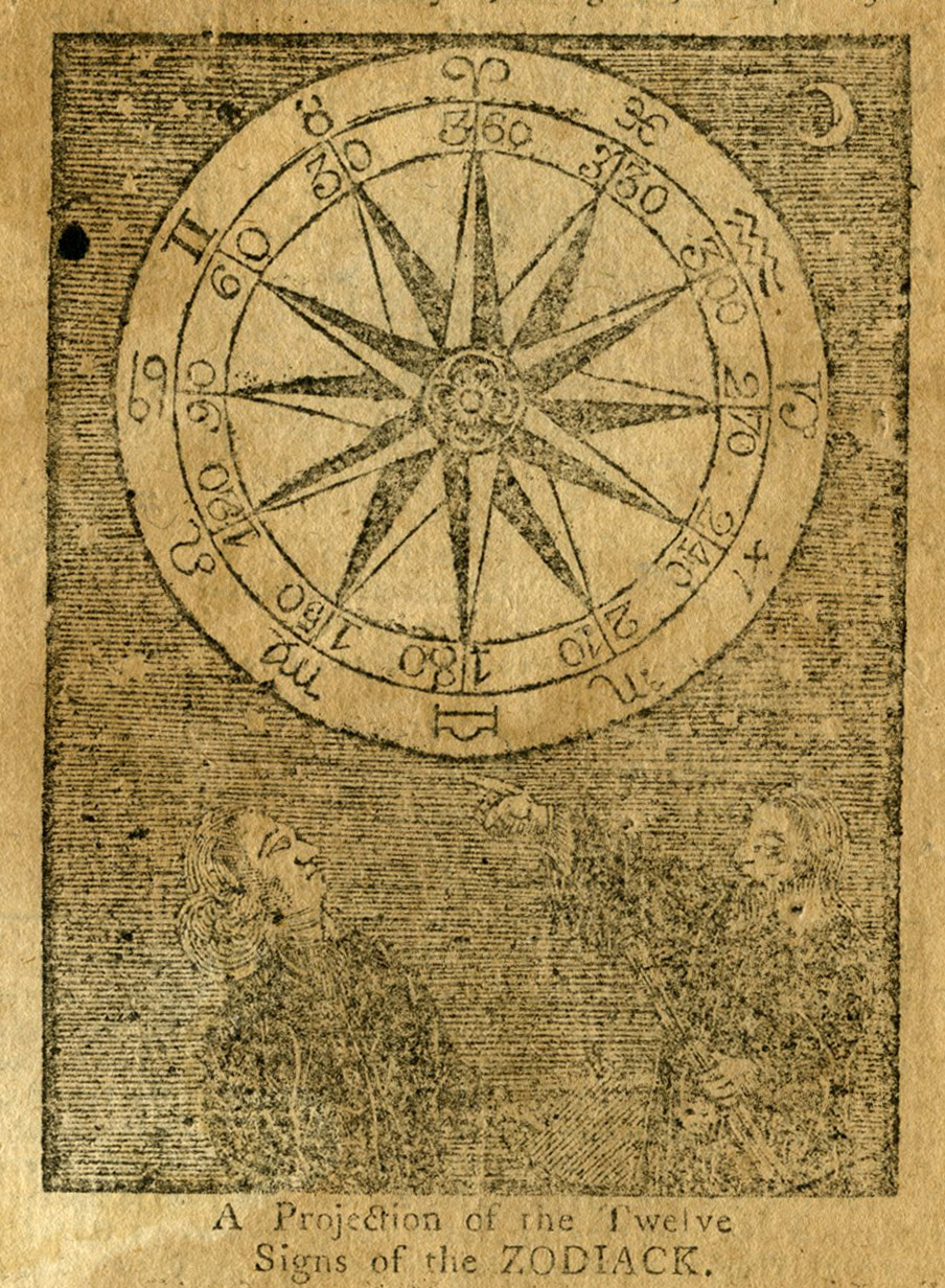 Another example is this fine woodcut "A Projection of the Twelve Signs of the Zodiack" that appeared on the cover of The North-American's calendar and gentlemen and ladies diary in 1772:
