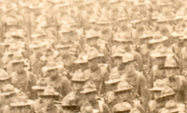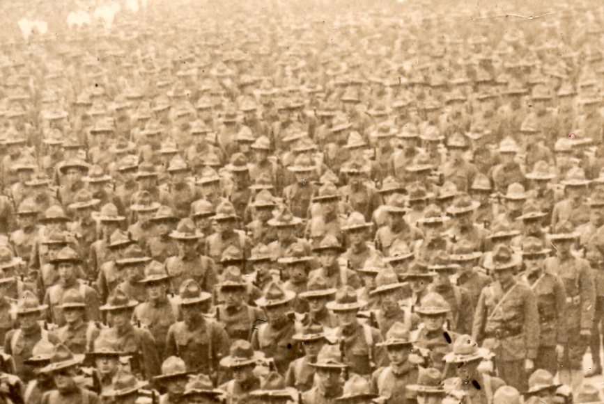 Generally images like this are a virtual image-host for me, a bucket of ice cold water thrown onto a sizzling summer sidewalk, all sorts of ideas steaming from it. But for photographs of Doughboys1 marching, especially assembling for parade, this one struck me a little more oddly than most, giving instant pause, making me concentrate on the haze, or dust, that allowed the columns of soldiers to blend into one another and fade, losing their boundaries with their mass receding into a dull blur.