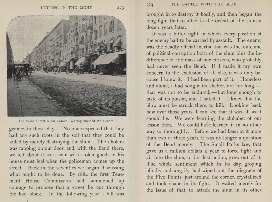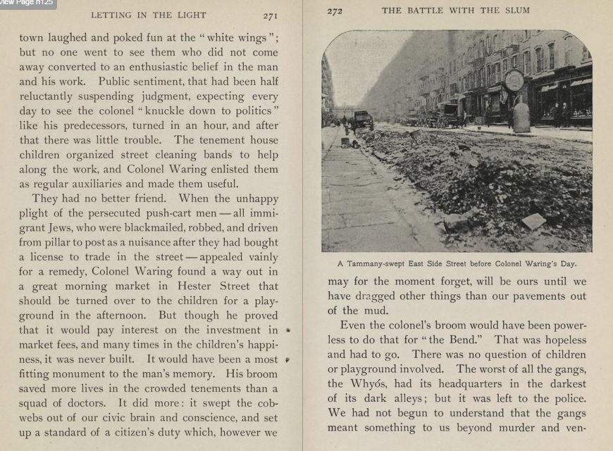 This story is told in the six pages (located below) from the great social observational/photo-documentarian Jacob Riis' The Battle with the Slum (1902) describing Col. Waring's efforts to clean the streets of Lower Manhattan. Riis is vicious with his treatment of the Tammany political machine for not undertaking any real effort to reduce the amount of street waste/filth, and heaped much praise on Waring, who he declared as the first to open the slums up to the light. That is just about right, and probably understates the case somewhat, as he was responsible through these efforts in saving the lives of thousands of people and improving the living condition for most of the city, in general.