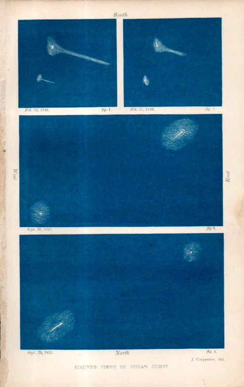 Some of the most interesting Found-Art images in the history of science belong to astronomy, and within that, some of the most expressive and least-populated images of great appeal and haunting beauty are for early images of comets. And so it goes for this ("tinted") engraving of Biela's Comet, which illustrated an article by London-born W.T. Lynn (at the time with the Royal Observatory, Greenwich) which was published in the April, 1867 issue of The Intellectual Observer. The comet was named for Wilhelm von Biela who discovered the periodic nature of the comet (6.6 years, it had been identified as early as 1772), and had disappeared by the 1850's, but not before breaking up into at least two large pieces, which is what we are looking at below: