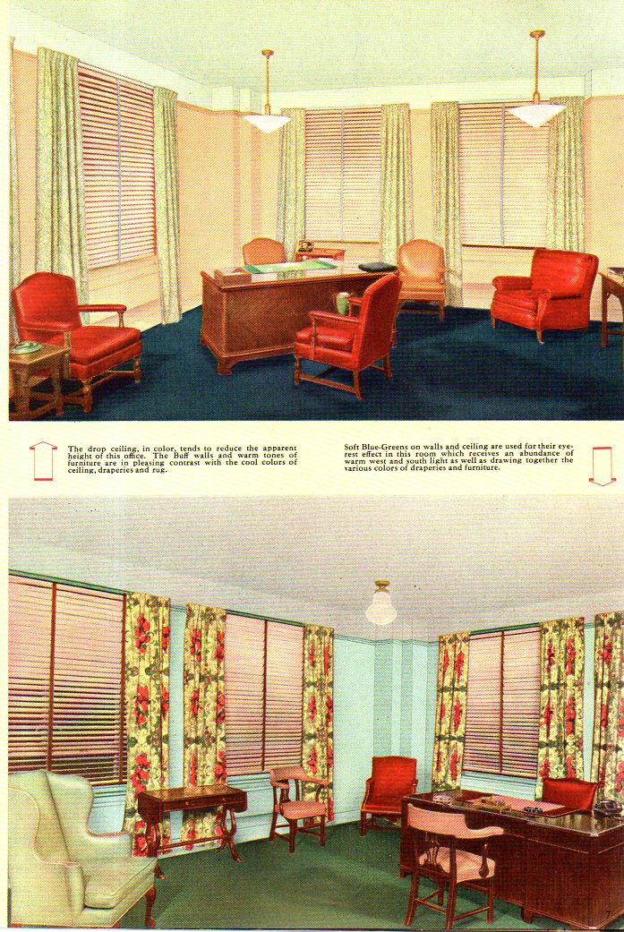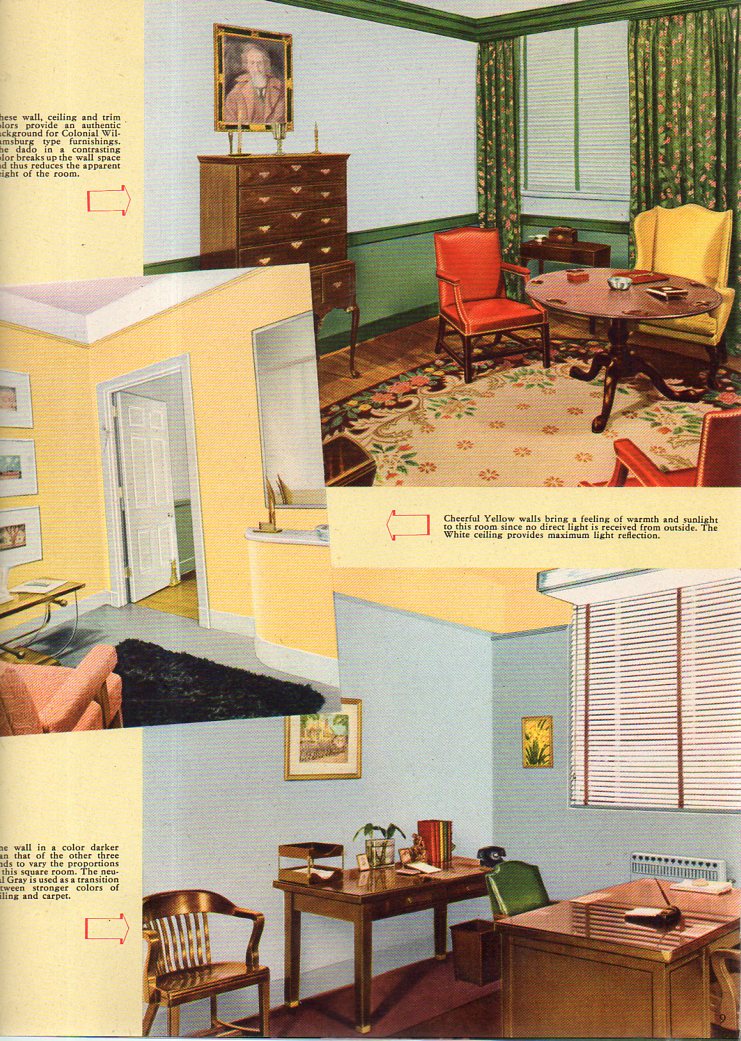 The images come from an innocent-sounding pamphlet published by Pittsburgh Paints: Pittsburgh Color Dynamics for Offices, Hotels and Restaurants and published in Pug in 1945. The cover gives it all away, and then once inside you are immediately invited to the design equivalent of a happy version of Nemo in Slumberland. For example, a living room, begging for someone to sit in and enjoy a cup of coffee while wondering when Joe DiMaggio would be back in pinstripes, and where the smokes were, and what happened to all of the missing artwork: