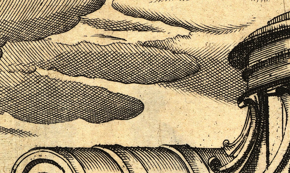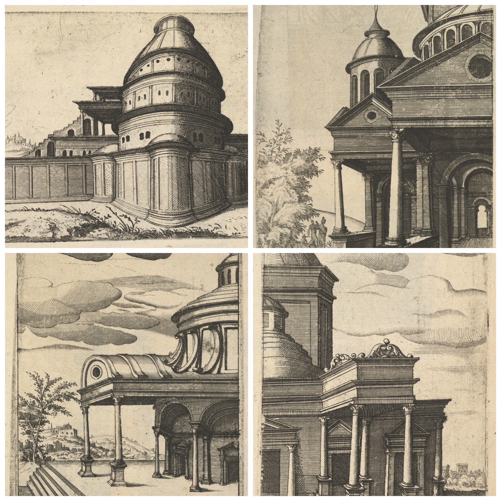 The following four details are from engravings (all reproduced in full, below, in a montage) from Ruinarum variarum fabricarum delineationes pictoribus caeterisque id genus artificibus multum utiles, ca.1550: