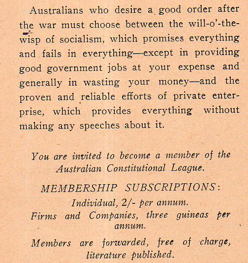 This cover design decorates a pamphlet from the Australian Constitutional League of Sydney, written towards the end of WWII, and visualizes a post-war Australia in terms of free enterprise vs. socialism. Needless to say the pamphlet took a dim view of the prospects for a Socialist Australia. From my brief read of the little pamphlet, the Utopianopolis on the "myth" side of the future belongs to what the Socialists could never deliver; on the right side, the "reality" part, as socialism "promises everything" but "fails in everything".