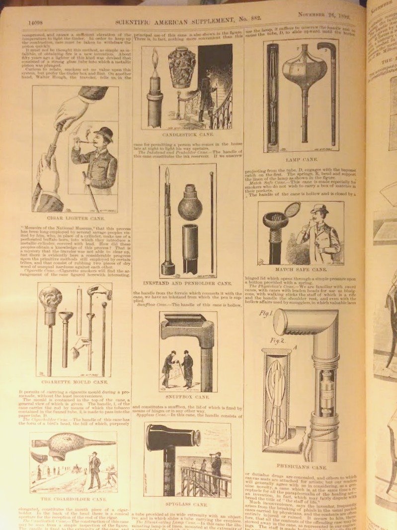 The walking stick continued to be a "thing"--a gentleman's pursuit of gentlemanliness, of refinement, or culture, or style, and so on--deep into the 19th century. And as we can see in this sample from the Scientific American Supplement for November 26, 1892, people were interested not only in sticks but also in what other things the cane could do for them while perhaps aiding them in walking. Some ideas are sort of good, while others, not so. An example of the later might be the following--using your cane head as a cigar holder allowing you to smoke your stogie through the beak of a duck: