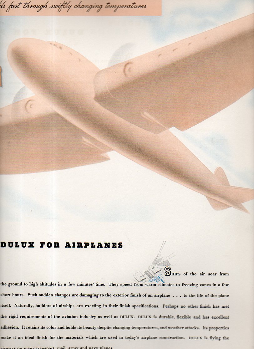 1. Dulux Marches On, published in 1935 by du Pont de Nemours & Co. in Wilmington, Delaware, an oversize (13x9") sales/promotional pamphlet extolling the successes of their six-year new product (a polymetric resinous material that added varnish-like resiliency and luster, which they was breakthrough in finishing history"). I like the Finishing History segment as a departure for a short story, but not here.