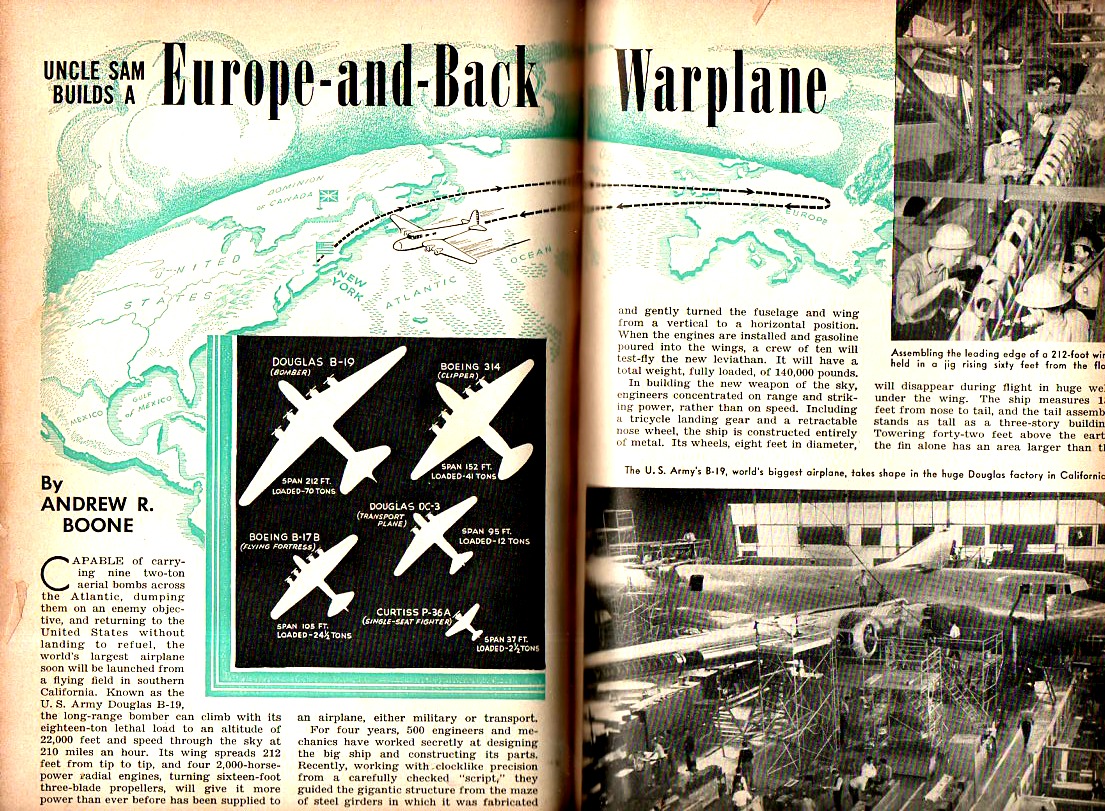 The massive B-19 bomber built by the Douglas XB-19 (originally designated XBLR-2, the eXperimental Bomber Long-Range 2) was a prototype for a U.S. Army Air Corps transcontinental bomber--a striking and revolutionary plan when it was begun in 1938. So far as I can tell this is an early public discussion of the aircraft--it must have been an intimidating piece of propaganda so far as Axis forces were concerned. It was about the size of a 747 and carried an extended crew of 24 for the long mission, which could see the plane to Europe and back over a 24-hour-long flight as it lumbered out and back at about 180 mph (which would explain the crew rotation and size). At the heart of the aircraft was its 18-ton payload--dwarfing the then-huge payload of the B-17B's 3 tons (and later 17G's 4.5 ton), which was deliverable in a flight range of over 7,000 miles, which was more than three times that of the B-17.The aircraft first flew experimentally in 1941, but even then it was seen as being of an obsolete design, and wound up being discontinued by 1949. The development of the plane served its purpose in aiding design for other aircraft, and it never saw service during the war.